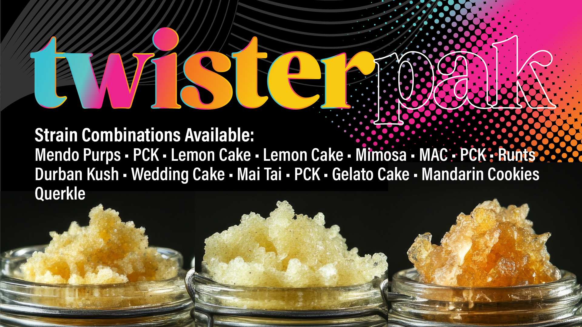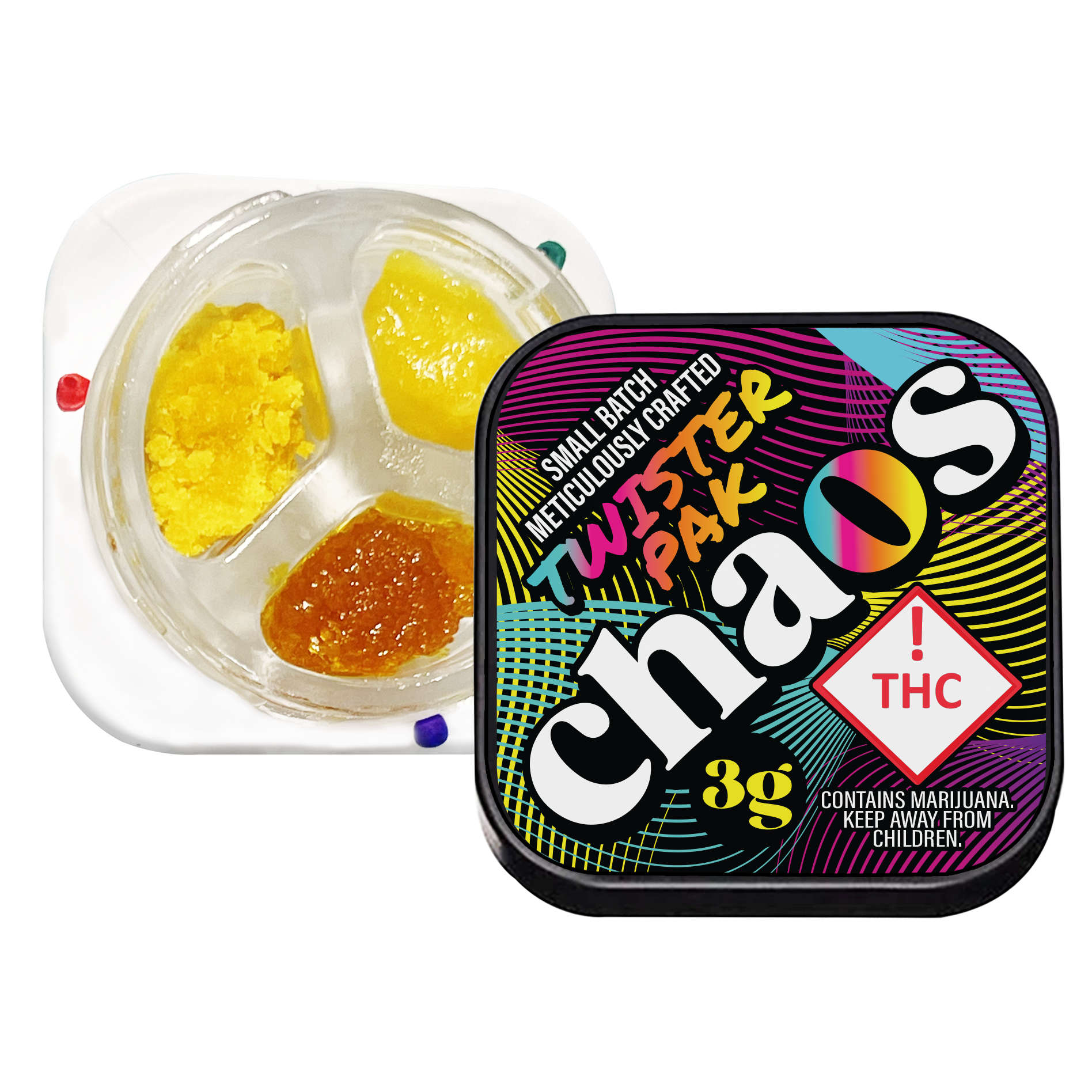 Get ready to witness an industry game-changer! Feast your eyes on the Chaos Twister Pak – it’s a party in a single, brilliantly designed container! Imagine this: one sleek, compartmentalized unit holding THREE distinct, top-shelf extracts – think the crystalline snap of shatter, the sugary sparkle of wax, or the terpene-packed punch of live resin – each a different, meticulously selected strain, all kept perfectly separate by this seriously innovative design. You can snag ’em in all Indica powerhouses, all Sativa energy bombs, or a snoozing Indica’s, or Hybrid mix-n-match strains!